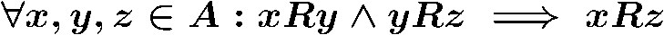 for all x and y and z in (set) A, (condition) x R y and (condition) y R z implies (condition) x R z". The symbol "